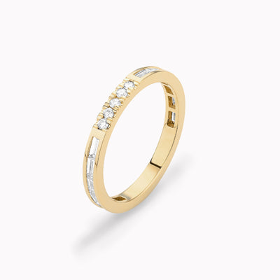 Round and baguette channel set diamonds switch off around this beautiful gold band. The perfect ring for any ring or wedding stack.
