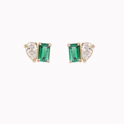 Toi et moi studs featuring a lab-grown pear white diamond and a lab-grown emerald-cut emerald prong set in 14k yellow gold.