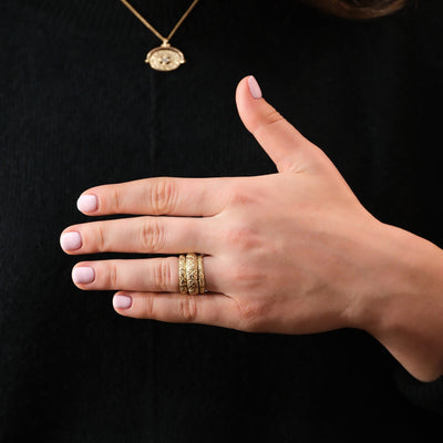 Inspired by medieval posy rings that were designed and given to communicate secret messages of love. Bold asterisk stars circle the outside of this ring.