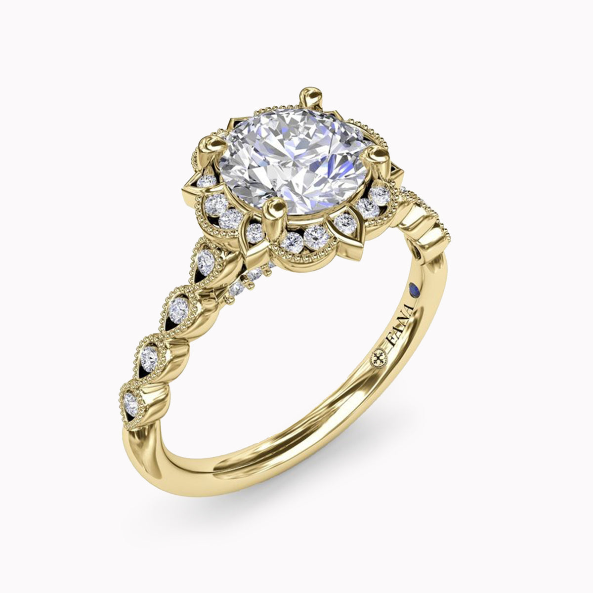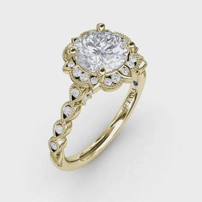 Incredible workmanship defines this intricate floral-inspired round diamond engagement ring wreathed in clusters of round diamonds set in milgrain-edged petals or smooth leaf-shaped bezels. The leaf motif and milgrain details are echoed in the diamond band, while a swoop of pavé on the gallery provides the finishing touch. This design can be customized based on stone shape and metal preference.