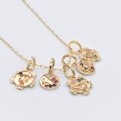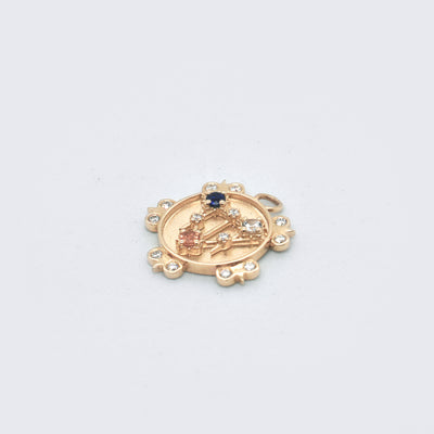 Mini Lace Shield medallion featuring three sapphires (blue, yellow & white) and diamond florets. This design was inspired by intricate ironwork discovered in northern Italy, and the shield symbolizes tradition, stability, protection. Customize this charm with the gemstone of your choice. Click here to view all the different gemstones & birthstones. Exclusively at Eliza Page.