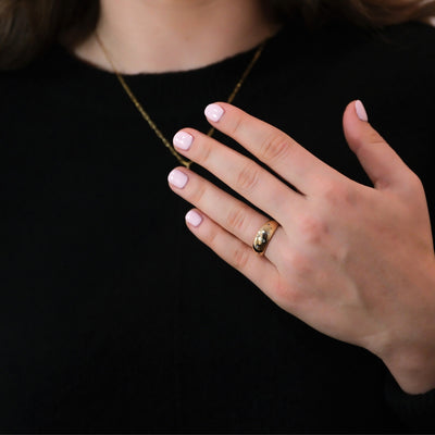 An 14k rounded gold dome band with scattered flush-set diamonds. A classic form accented with subtle sparkle.