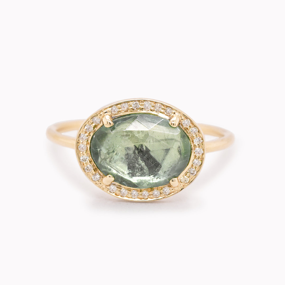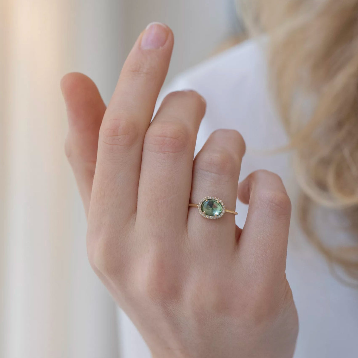 This beautiful gemstone ring features a green tourmaline with a diamond halo on a thin yellow gold band. Green tourmaline has many spiritual and healing powers as well as magnetic and protective properties. Green tourmaline encourages gratitude, patience, and serenity.