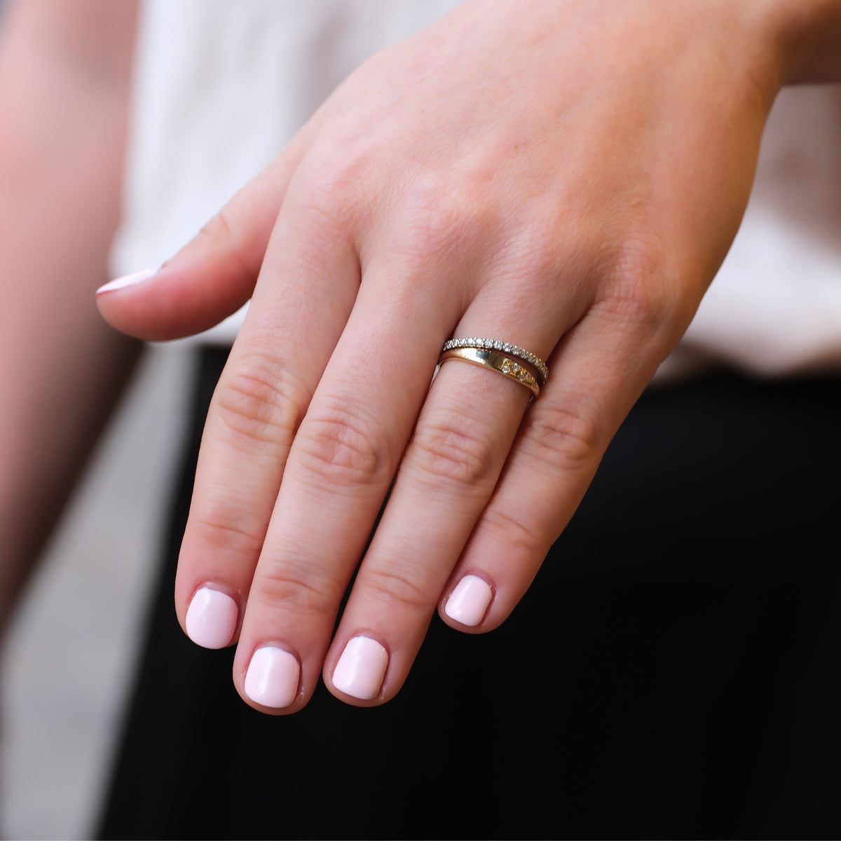 Tapered stack ring with five offset cluster white diamonds.