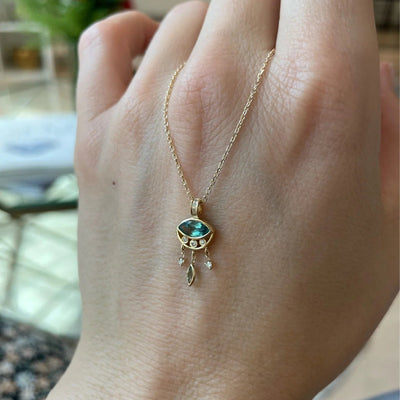 A petite evil eye-inspired pendant featuring a marquise green tourmaline framed in gold with diamond accents, symbolizing intuition and protection. Pavé diamonds and a tourmaline gemstone dangle to add subtle sparkle while creating graceful movement.