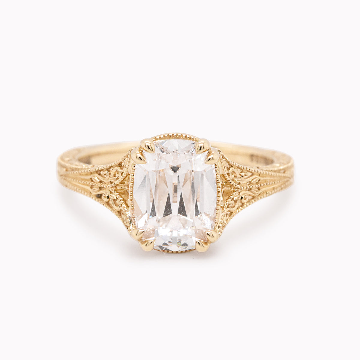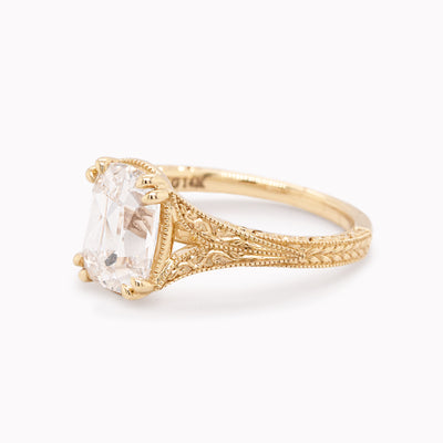 The Bridgette engagement ring features a lab-grown 2.61ct cushion old mine cut diamond shining at the center. This engagement ring captures the charm of old-world romance with the diamond framed by an ornate setting with hand-engraved detail and milgrain accents. Its vintage inspired silhouette celebrates beauty and love in every angle.