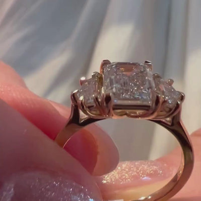 The Grace engagement ring features a lab-grown 1.85ct emerald-cut diamond shining at the center, accented by 0.43ctw lab-grown cadillac side stones. Clean, structured, and full of light, this ring delivers modern glamour with a timeless heart.