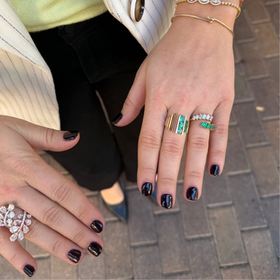 Beautiful bypass ring featuring baguette emeralds and white diamonds prong set in 18k yellow gold. Each gemstone is set in a row that curves gracefully and wraps around the finger.