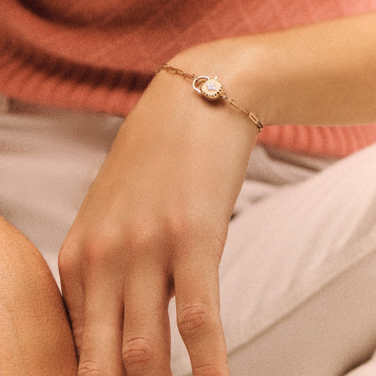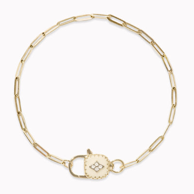 This bracelets blends the vintage charm with a paperclip chain. The clasp, transformed into a minimalist padlock with ginger white resin and four diamonds, it serves as both a functional detail and a symbol of redefined connections.