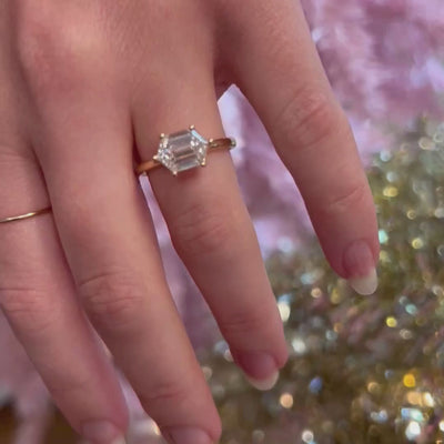 Our Sloane engagement ring featuring an elongated east/west, step cut hexagon white diamond in a six prong setting in 14k yellow gold. Part of our exclusive Eliza Page Collection.