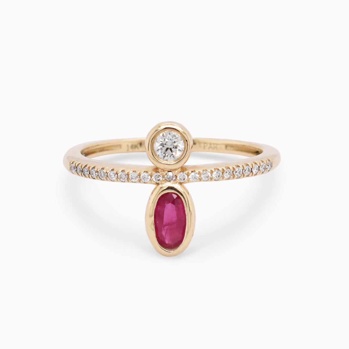 Artistic ring featuring a bezel set oval ruby and a mirrored round white diamond complemented by pavé diamond accents on a thin gold band.