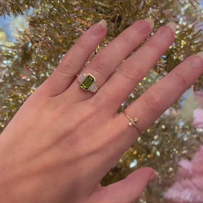 Our Elliot engagement ring features an emerald-cut bezel set 1.44 carat green tourmaline center stone, with four tapered diamond baguette side stones in a high polish finish. Part of our exclusive Eliza Page Collection.