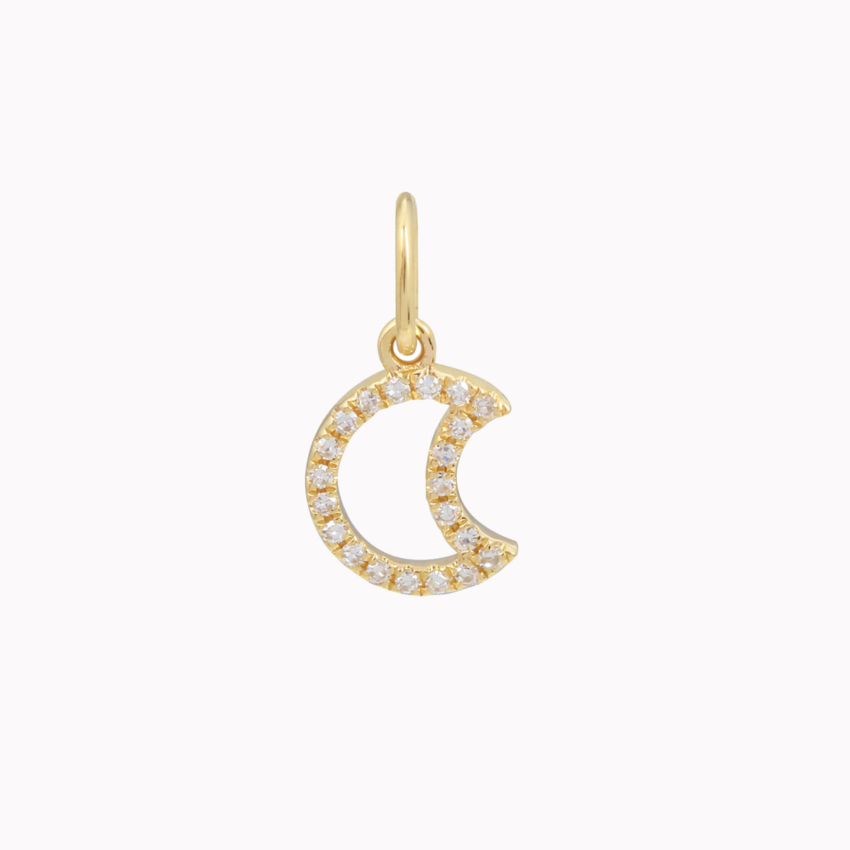 14k yellow gold open moon charm encompassed with diamonds and a gold bail.