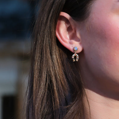 These horseshoe earrings blend iridescent opals with multi-colored sapphires set in warm 9k yellow gold. Horseshoes symbolize luck and positivity and embody protection to its wearer.
