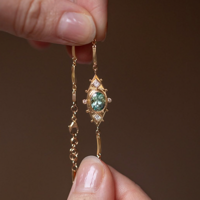 14k light yellow gold articulated bar bracelet with an evil eye gold plate set with a light green oval tourmaline eye and diamonds.