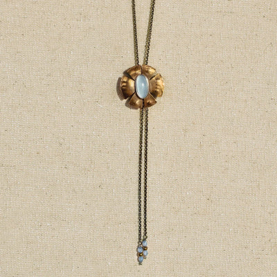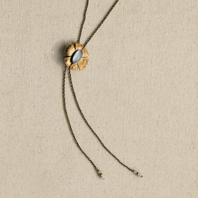 Handcrafted with oxidized brass, sterling silver & blue moonstone glass, the Flora Bolo has a mechanism on the back which allows it to slide up & down, giving you the option to wear it at multiple lengths.