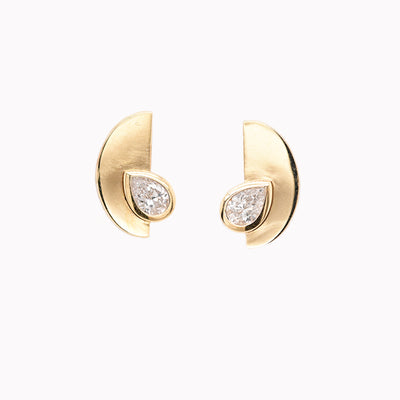These beautiful abstract earrings stand out with an angled bezel set pear diamond on 18k yellow gold semi circles.