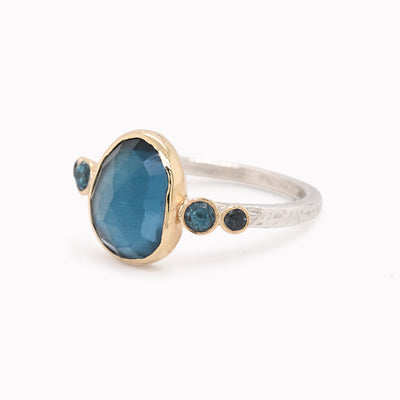 This beautiful, vibrant London blue topaz is set in 14k yellow gold accented by blue hued zircon gemstones on either side. Set atop a sterling silver band, this statement ring is the perfect everyday piece of blue glamour.