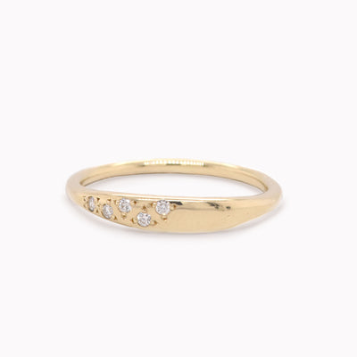 Tapered stack ring with five offset cluster white diamonds.