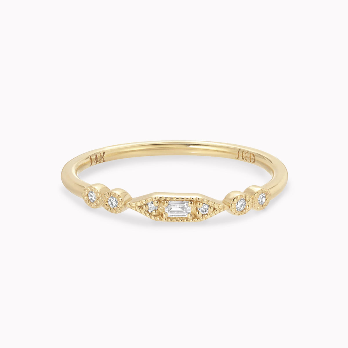 The Diamond Nayara Ring is the perfect everyday ring that doesn't feel boring or basic. She's dainty but full of beautiful detail and has just enough sparkle to make you feel fancy featuring one baguette center diamond and six round diamonds.