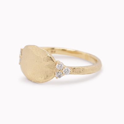 This ring in textured gold, evoking the delicate appearance of gold leaf. The gold catches the light with every movement, while cascading diamonds intertwine and echo each other, creating a play of brilliance and fluidity.