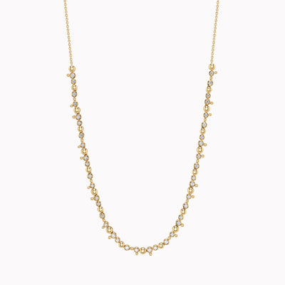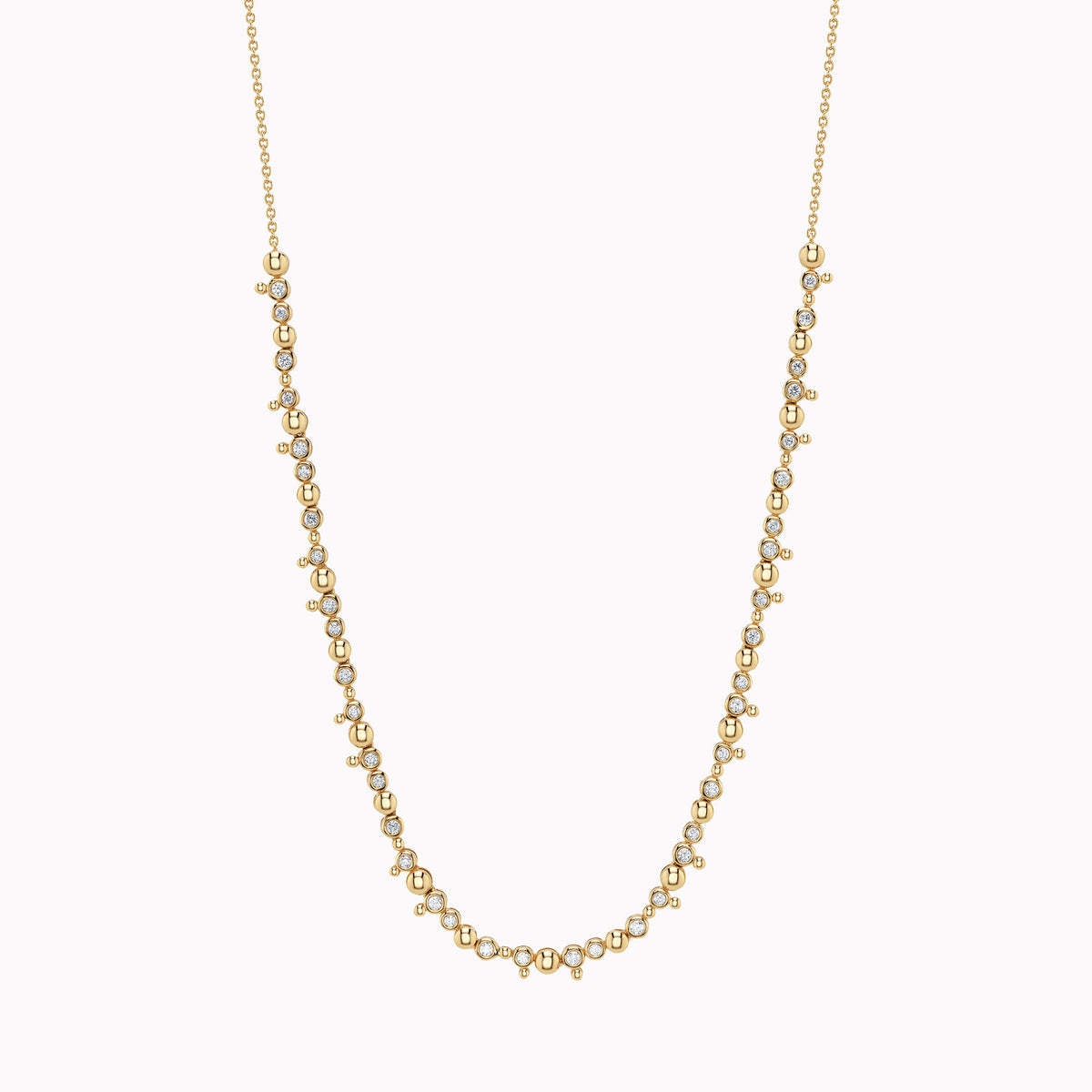 This necklace features diamonds securely bezel set with gold beads. The chain’s design ensures the necklace rests beautifully along the neckline with an adjustable bolo chain.