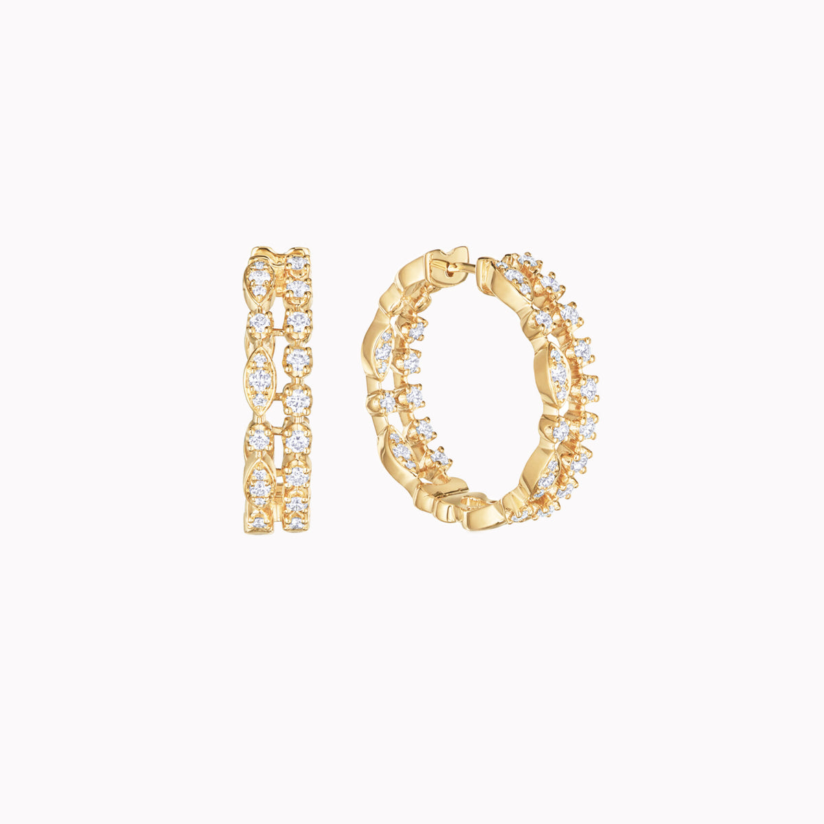 Diamonds float in a sparkling, celestial display. These modern double hoop earrings showcase the beauty of Kwiat diamonds, each meticulously cut to the highest standards. Set in 18K yellow gold, they frame the face with beauty and light.