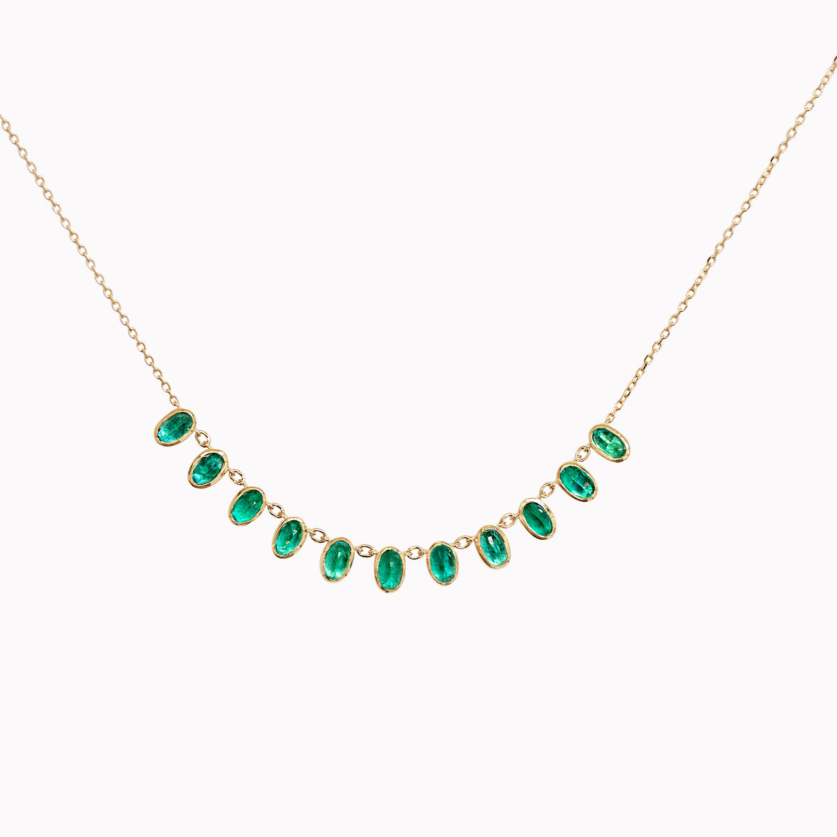 14k light yellow gold eleven emeralds necklace. The stones come in an intense green. Emerald is often referred to as the love stone, embodying harmony, compassion, and unconditional love.