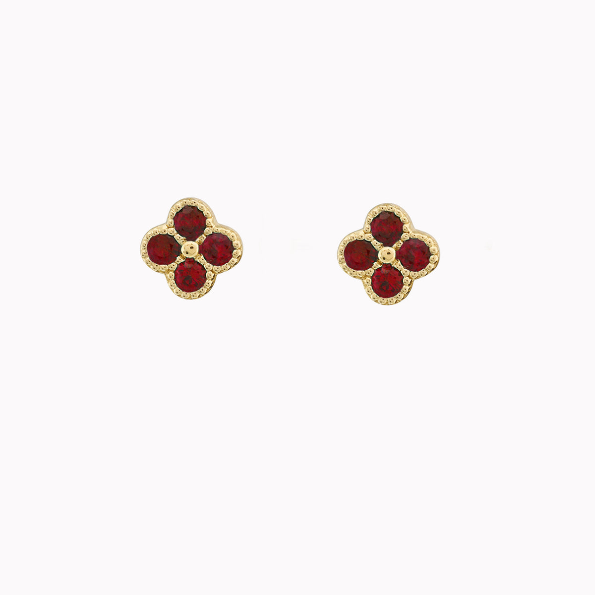 Ruby clover stud earrings with milgrain details set in 14k yellow gold.