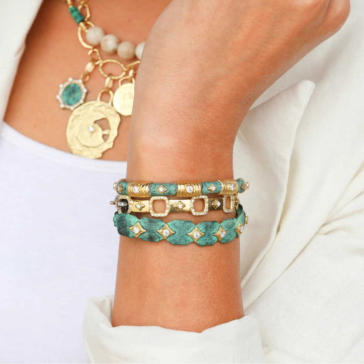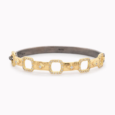 This bangle bracelet showcases a striking mix of grey oxidized sterling silver and 18k yellow gold. The paperclip design is set with white diamonds and crivelli eccents, enhancing the bracelet’s vintage-inspired charm. Perfect on its own or layered with other bangles, it’s a sophisticated statement of craftsmanship and contrast.