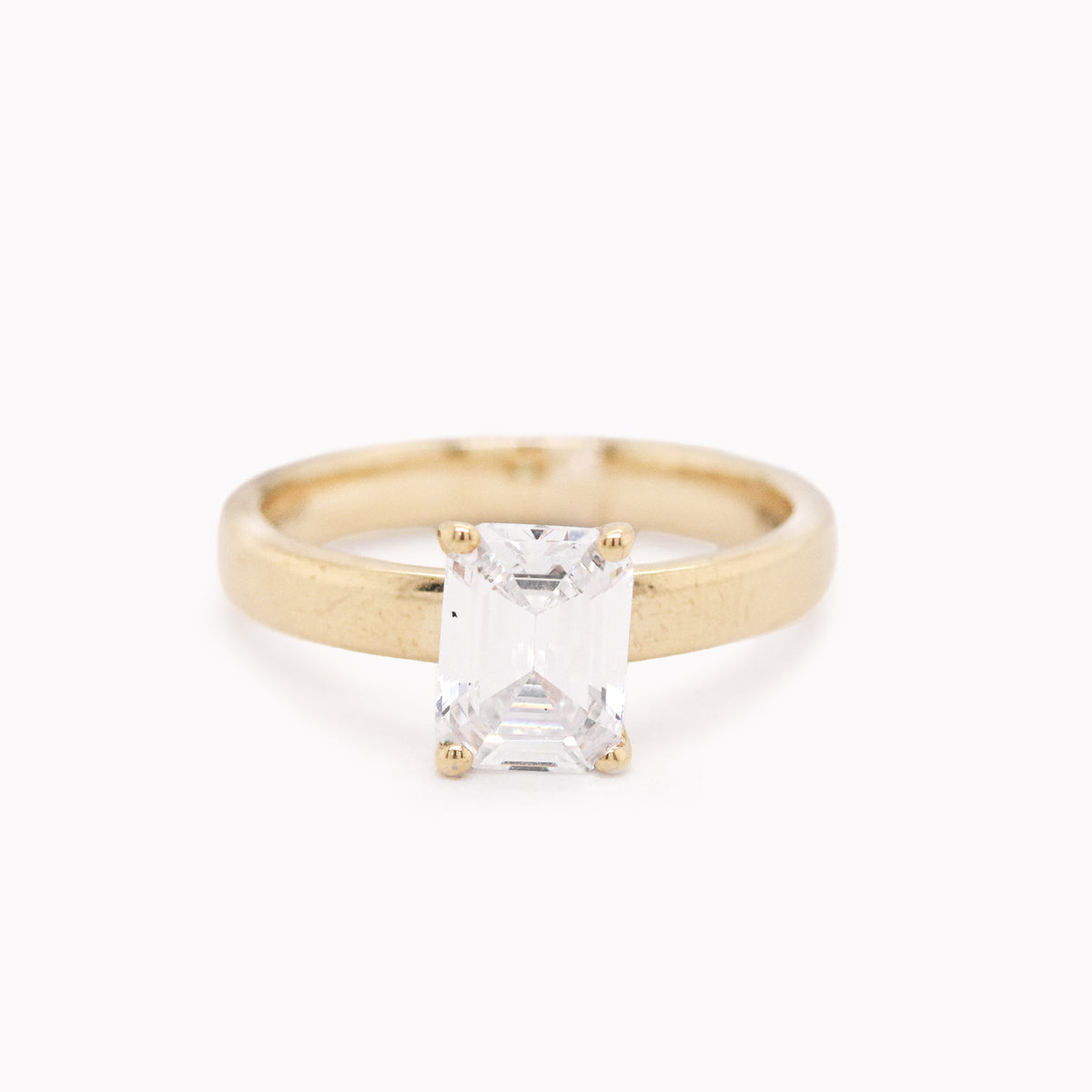 The Hélène is a solitaire, prong set emerald-cut engagement ring setting on a wide band. This style can be customized based on stone and metal preference. Part of the Eliza Page Collection.