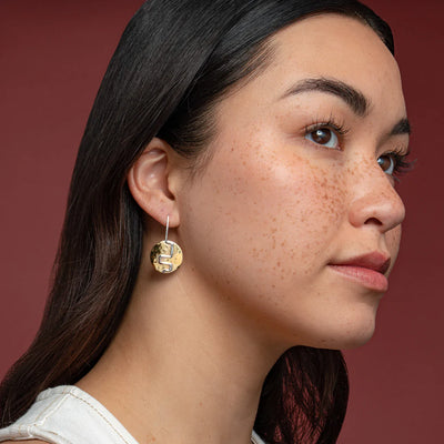 Brass will begin to develop a unique patina with time. Embrace this wabi-sabi aesthetic and appreciate the deepening contrast between the metals within this piece. Should you want to brighten the earrings up, give them a few swipes with the white polishing pad included in your order.