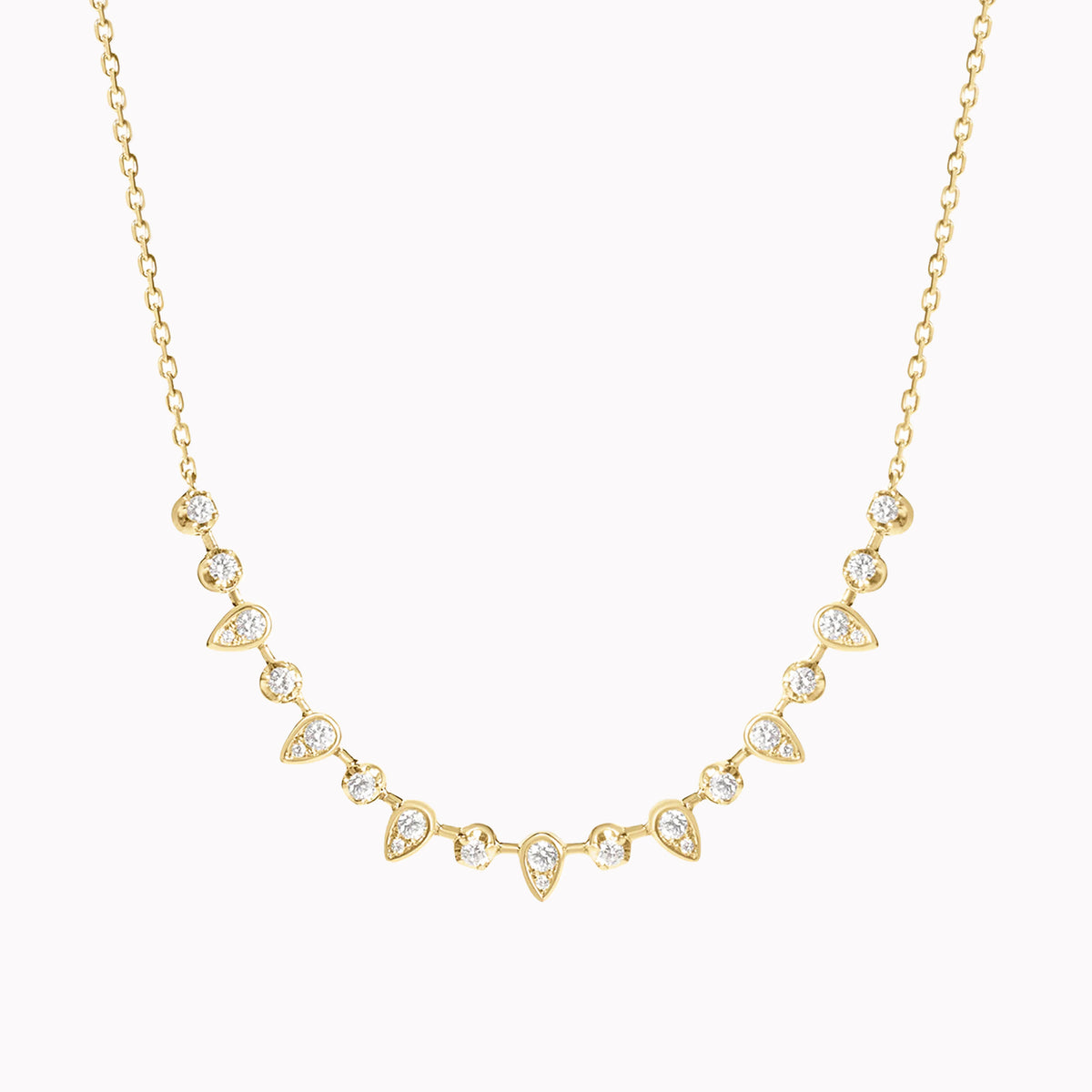 A delicate rhythm of sparkle, this necklace features alternating round and pear shaped diamonds set in 14k yellow gold. The graceful drop shapes create soft movement and dimension with the diamonds hanging from a cable chain.