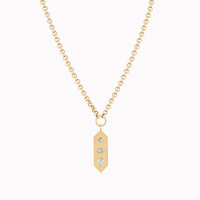 14k gold small rolo chain necklace with a small ring featuring a vertical brushed gold elongated hexagon tag pendant with a princess, marquise, and pear shaped diamond set flush in the pendant
