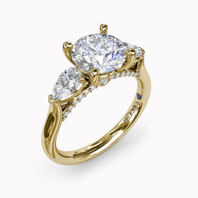 A traditional three-stone engagement ring with pear-shaped side diamonds and a subtly tapered, slightly curved band. A delicate chevron detail encircles the diamond’s girdle while a swoop of pavé on the gallery finishes the look. This design can be customized based on stone shape and metal preference. Part of the Fana Collection.