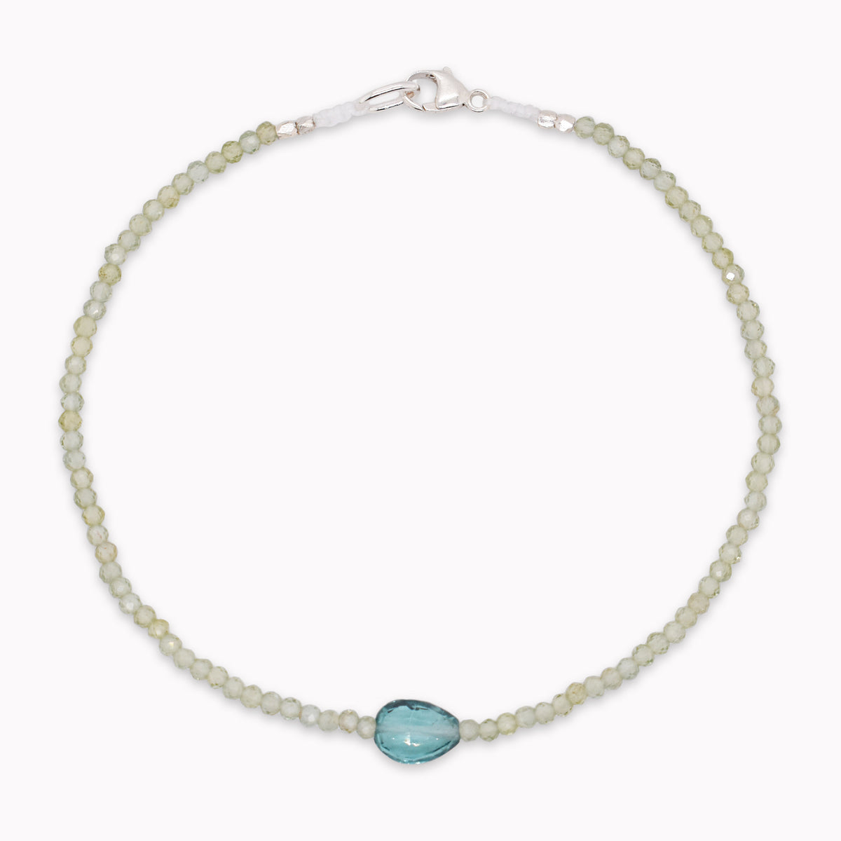 Green apatite gemstones are strung together on this bracelet with a blue apatite at the center and a sterling silver clasp.