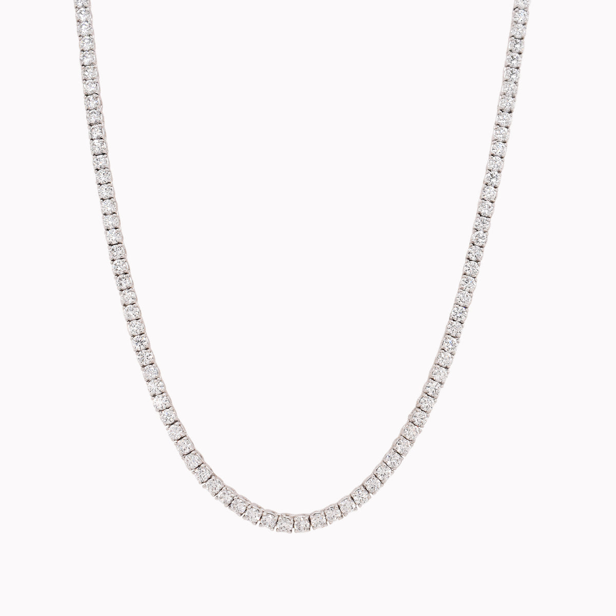 Individually linked prong-set white diamonds set in white gold. This elegant tennis necklace features 7 carat lab-grown diamonds that encircles the neckline.