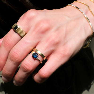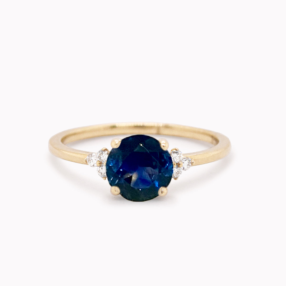 Our Anne engagement ring featuring one-of-a-kind round blue sapphire with a cluster of white diamonds on each side. Part of the exclusive Eliza Page Collection.
