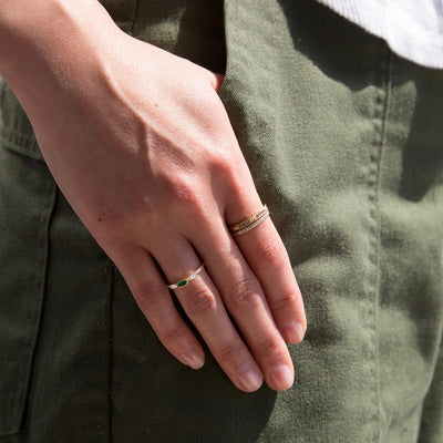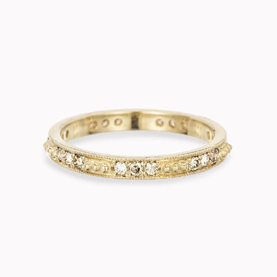 Warm champagne diamonds accented by delicate milgrain texture to really make this piece sing. It’s a touch nostalgic without feeling outdated and stacks so well with any piece.