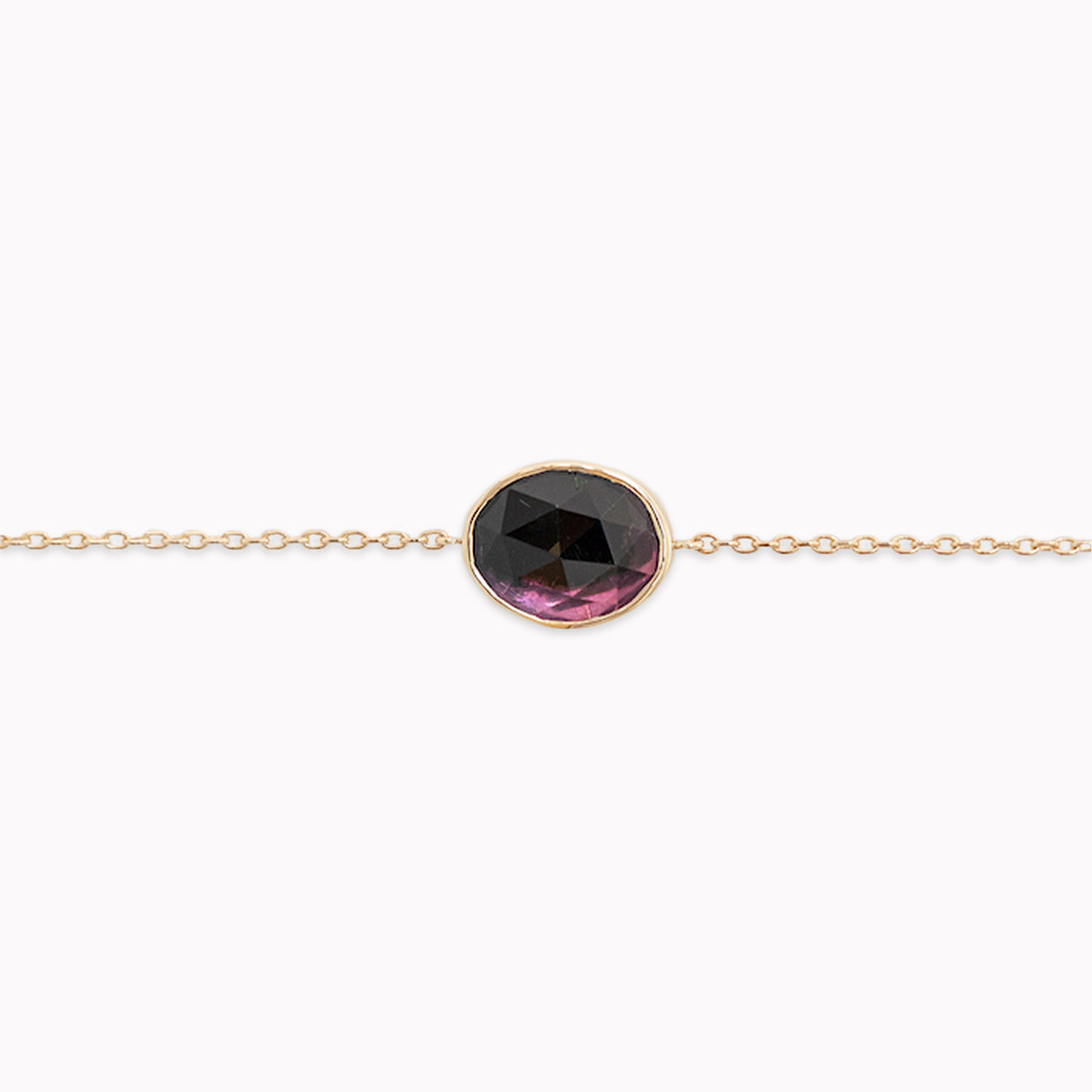 14k yellow gold bracelet with one vibrant pink tourmaline. Each stone is one-of-a-kind, size, shape, and color may vary.