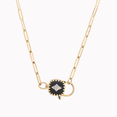 This necklaces design blends vintage charm with a more contemporary chain. The clasp, transformed into a minimalist padlock, serves as both a functional detail and a symbol of redefined connections. The lock can be worn in the front as a pendant or in the back and is encompassed with black resin and a north star of diamonds.