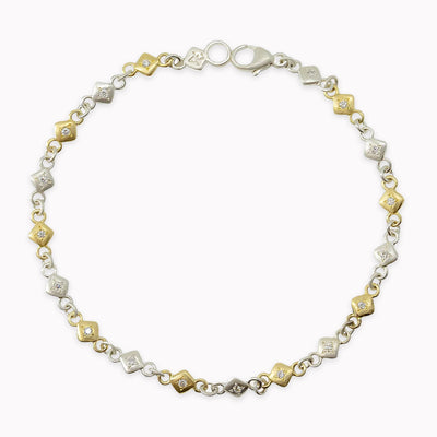 A study in contrasts, the versatile and memorable Charm Bracelet is handcrafted from 18K yellow gold and sterling silver, accented with 40 hand-set brilliant double-sided diamonds. Its timeless design effortlessly bridges day and night, offering a classic look with a modern twist, perfect for any occasion.