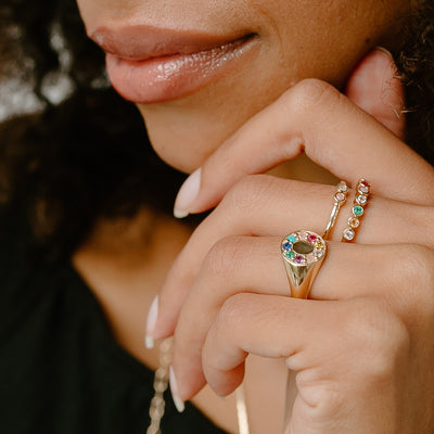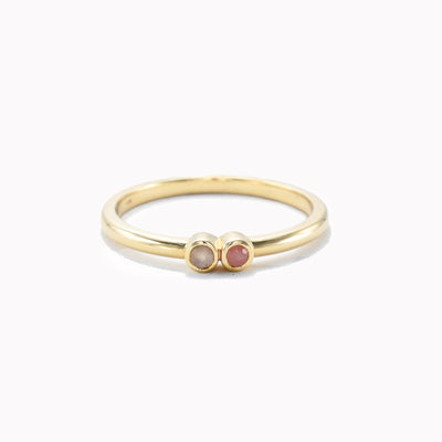 Petite 2 stone duo gold stacking ring featuring vibrant gemstones. This ring spells "OM", symbolizing inner strength and calm. Stones for this duo ring could symbolize the perfect pair, couple, or best friends. Exclusively at Eliza Page.