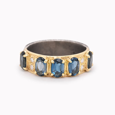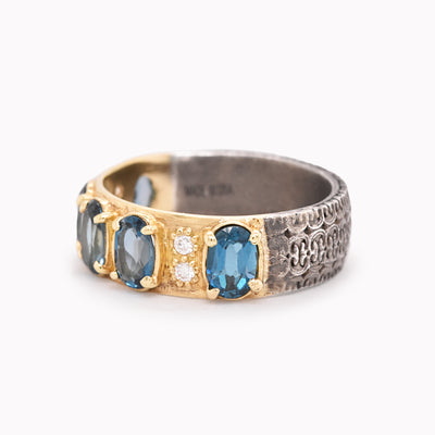Half 18k yellow gold and half blackened sterling silver wide band with five oval London blue topaz gemstones and white diamond accents.