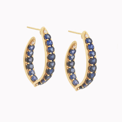 Bold and vibrant, these elongated oval hoop earrings are encompassed with round blue sapphires and a petite diamond accent at the top, and have a post butterfly back. The sapphires are mirrored on the inside, making the color pop from every angle.