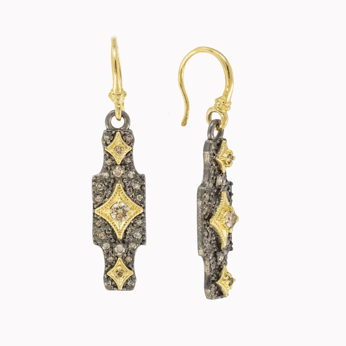 Unique vintage style, mixed metal drop earrings with champagne diamonds with recycled 18k yellow gold crivelli accents on a blackened sterling silver tag dangle.