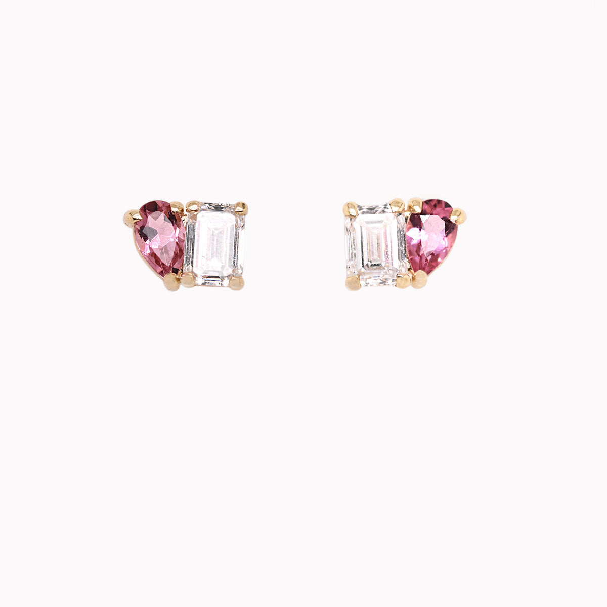 Toi et moi studs featuring natural pear-cut pink tourmalines and lab-grown emerald-cut white diamonds prong set in 14k yellow gold.