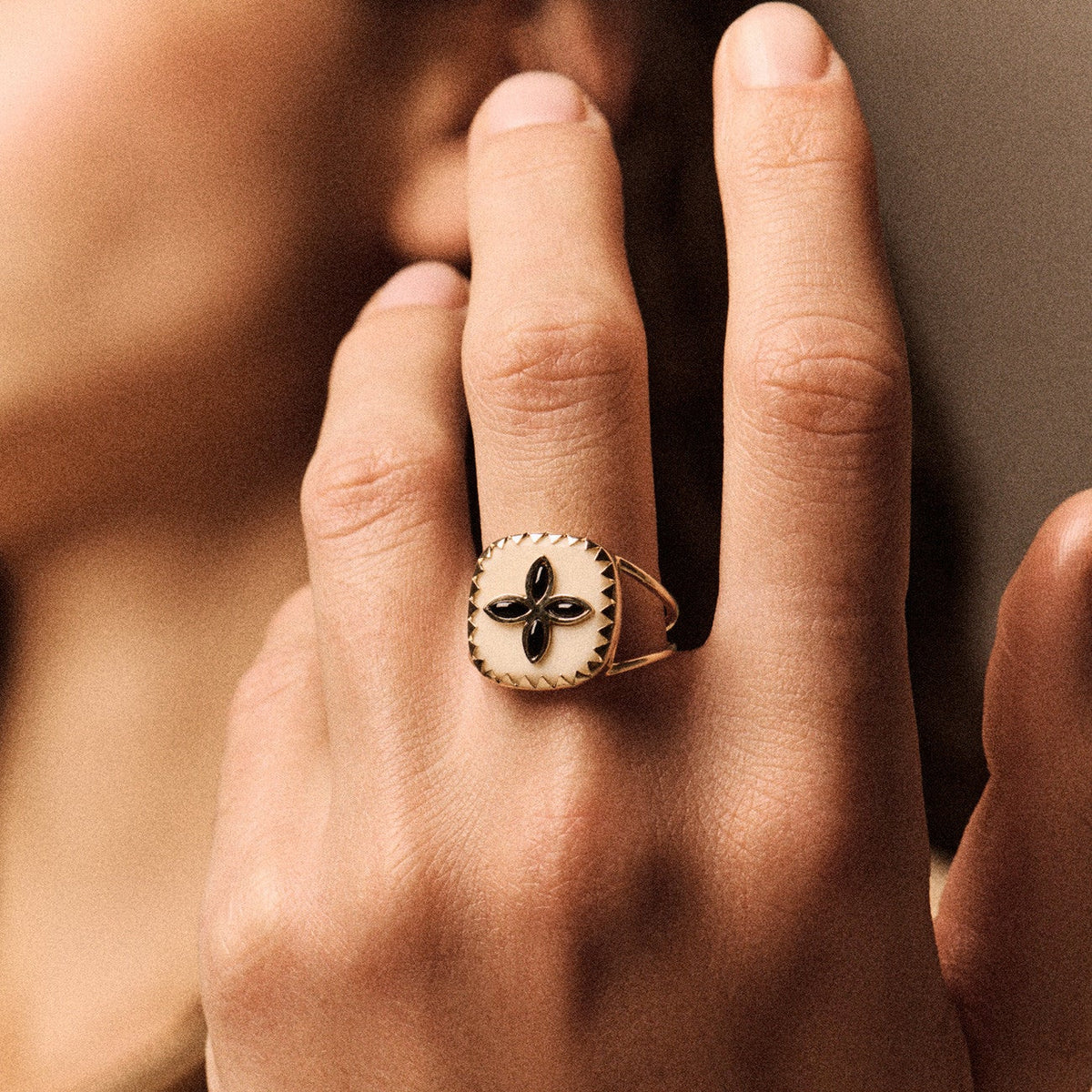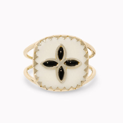 This ring features a sculptural thin double band that wraps the finger with balance and intention. The dual band frames the centerpiece beautifully, a white resin face with scalloped triangle bezel framing and onyx petals.