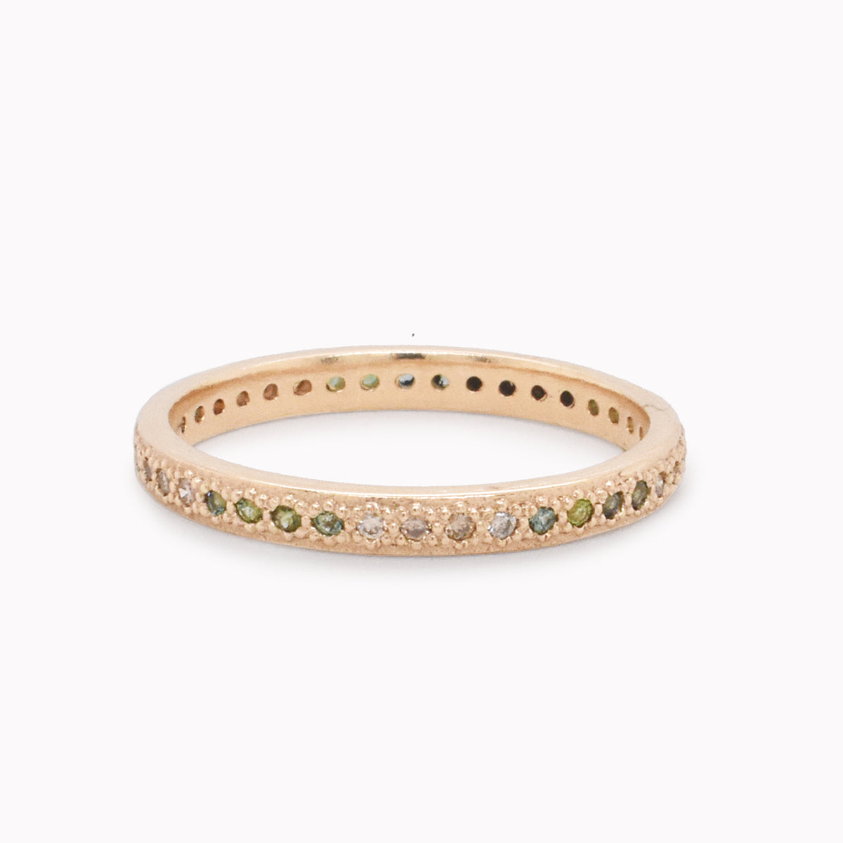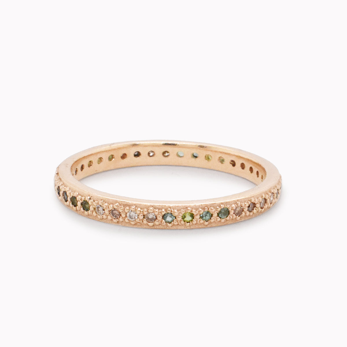 Rose gold eternity stack band with round blue-green tourmaline gems.