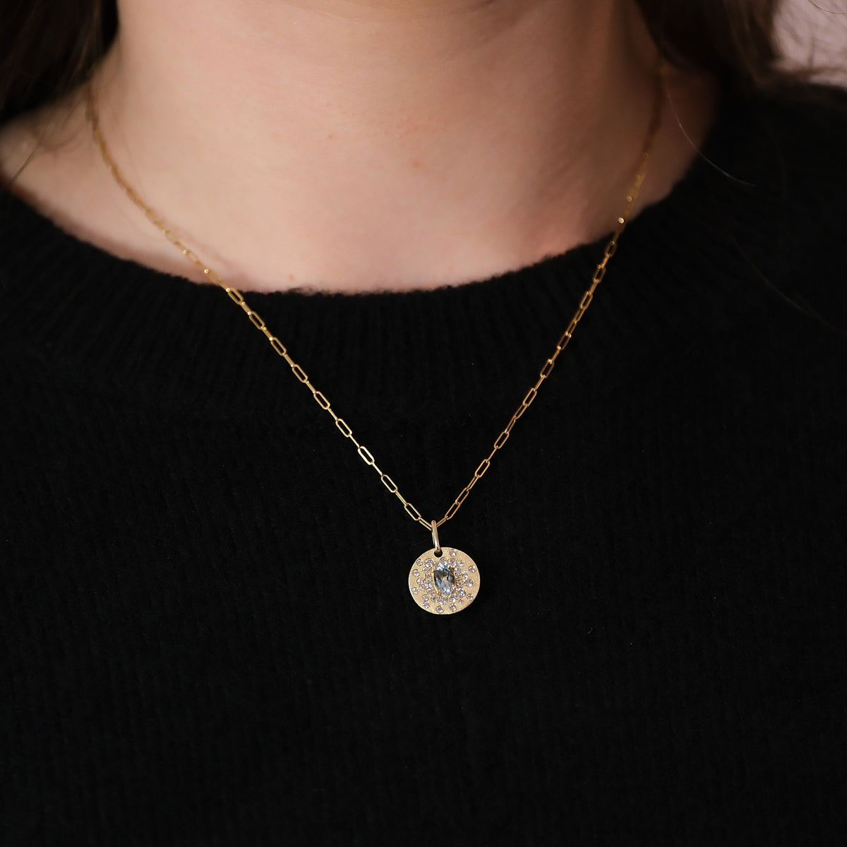 This satin gold finish disc pendant features an oval aquamarine gemstone with scattered white diamonds and hangs from a small paperclip chain.